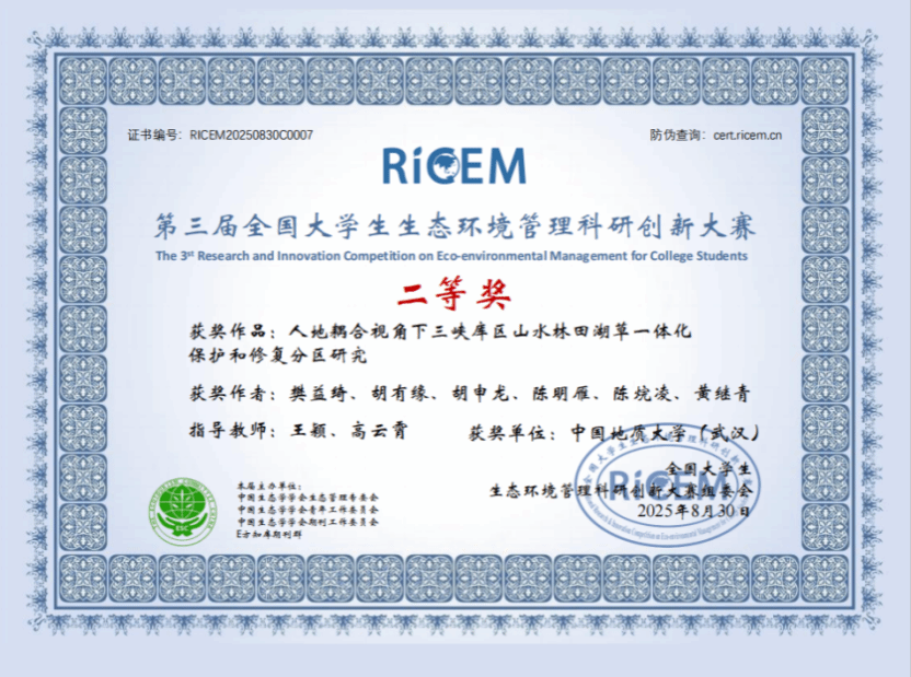 学子樊益绮、胡有缘、胡申龙、陈明雁、陈烷凌及黄继青组成的“南望只此青绿”团队,凭借作品《人地耦合视角下三峡库区山水林田湖草一体化保护和修复分区研究》荣获全国二等奖。
